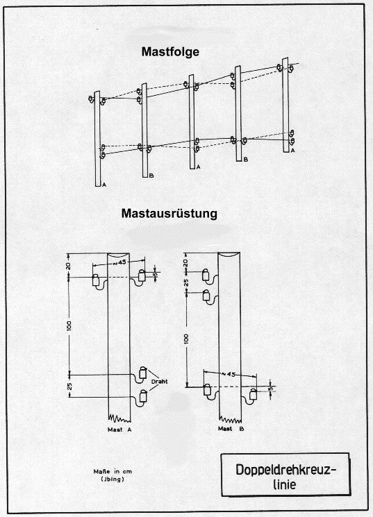 aus Fernmeldefibel 1 ( Draht ) 1959 Die Drehkreuzachse ist eine Felddauerlinie ( Blankdrahtfreileitung ) mit hochwertigem Induktionsschutz. Durch fortlaufendes Drehen der beiden Leitungsdrähte nach links herum und versetzen der zweiten (unteren) Leitung um 90° wird dieser Induktionsschutz erreicht. Die gegenseitige Lage der beiden Drähte einer Leitung wird vom Mast zu Mast um 90° gedreht,nach 4 Masten erreichen sie so wieder ihre ursprüngliche Lage.Alle 10 Km werden Kreuzungen eingebaut.Die Drehkreuzachse wird hauptsächlich für die Mehrfachausnutzung mit Trägerfrequenzgeräten errichtet. Ist sie vorschriftsmäßig und sorgfältig gebaut, so können weite Strecken mit hoher Tf-Ausnutzung überbrückt werden.